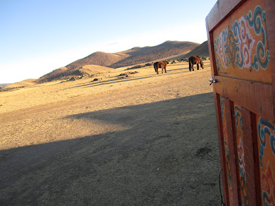 Fifteen minutes of walking through the golden countryside – past yaks and horses – and we found all of our gear already unloaded from the van and deposited in our Ger.