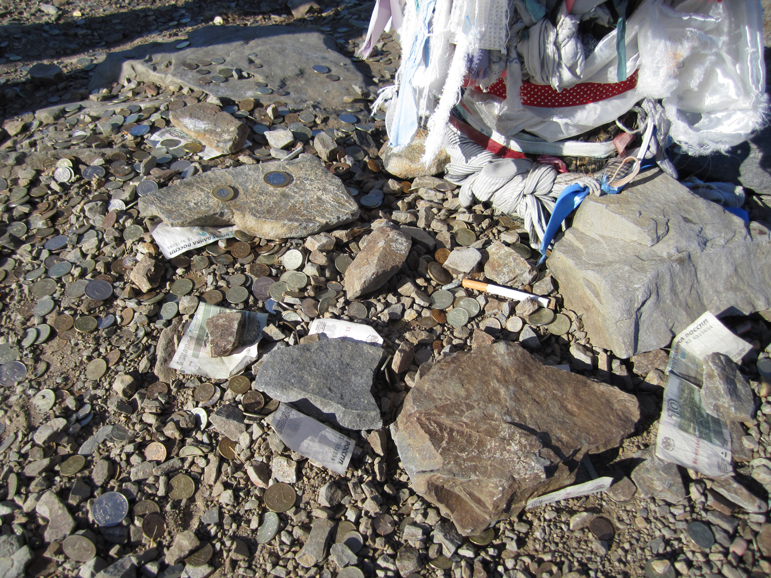 Its marked by a prayer pole where visitors leave offerings ranging from coins to cigarettes to ribbons.
