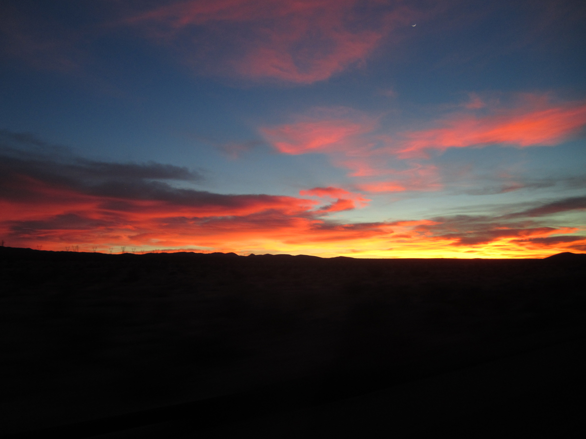 Hours of driving later and the sun was setting behind us over the Mojave Desert. Stunning.